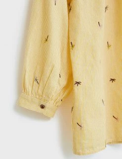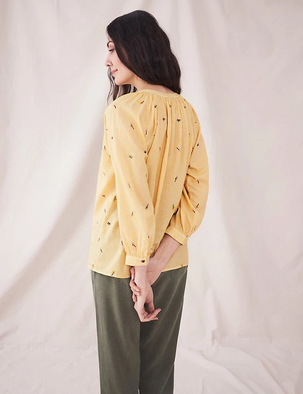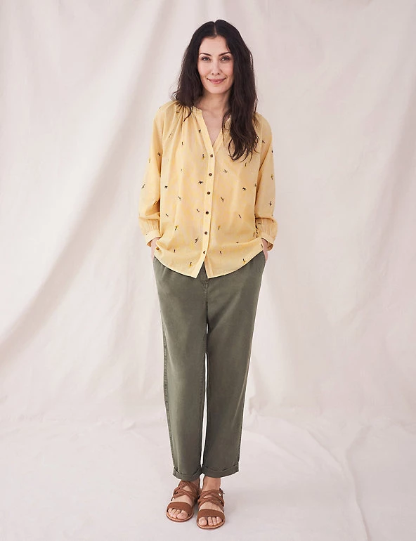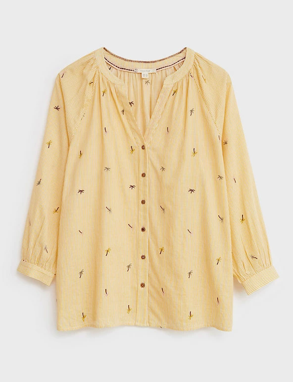 Tiny embroidered palm trees bring a tropical twist to this pure cotton shirt from White Stuff. Cut in a regular fit, it features a button-through front and flattering v-neckline. Pleating at the shoulders and back creates an elegant drape.