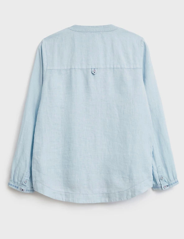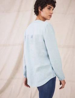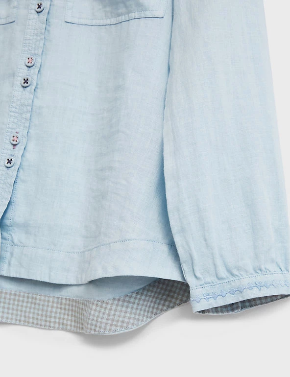 This pure linen shirt from White Stuff is the perfect smart-casual piece on warmer days. It’s cut to a regular fit, with a classic crew neckline. The long sleeves have buttoned cuffs with subtle embroidered detailing, and patch pockets on the chest bring a touch of utility chic. This shirt fastens with buttons that stand out on the placket with their contrasting thread.