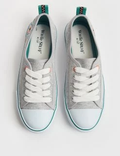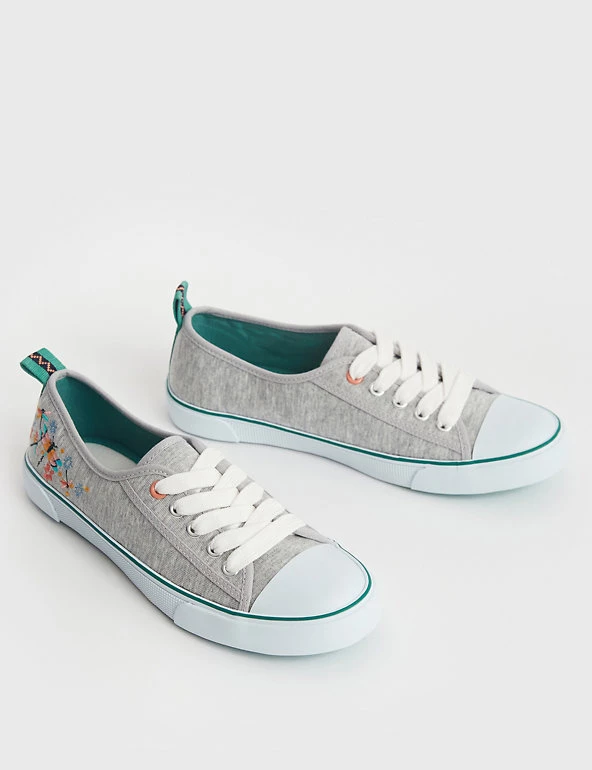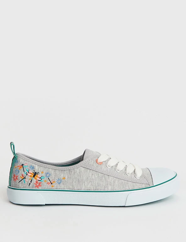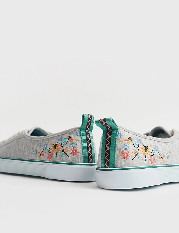These White Stuff lace-up pumps feature an intricately embroidered design of dragonflies for a gorgeously feminine feel. They’re made in a comfortable standard fit, with breathable cotton uppers and grippy rubber soles. Contrast tape and tabs at the back of the heel add a fun finishing detail.