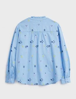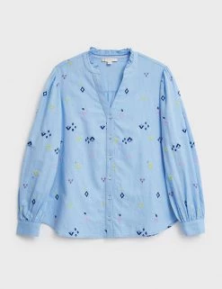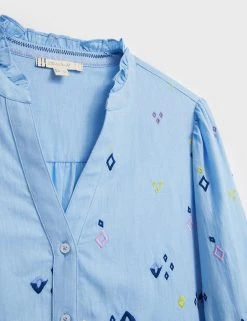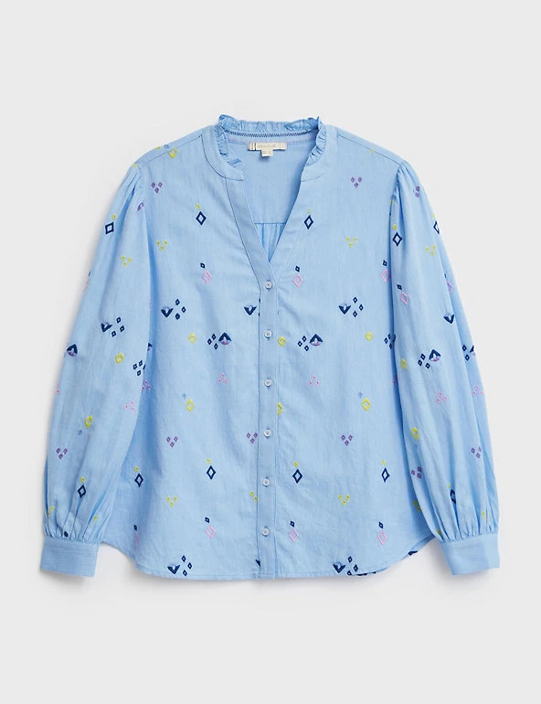 Refresh your weekend look by throwing on this statement pure cotton blouse by White Stuff. This regular-fit piece is adorned with striking contrast embroidery for a playful twist. It features a modern frilled v-neck design and a simple button-through fastening. Long sleeves with buttoned cuffs give it a smart finish.