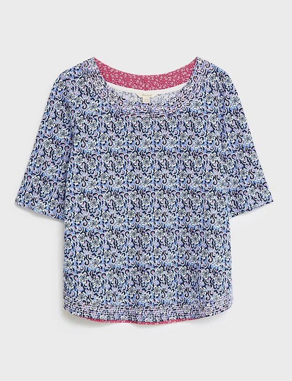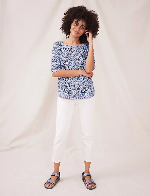 Put a fresh spin on your weekend look with this striking pure-cotton jersey top by White Stuff. This regular-fit piece features a playful all-over floral print. It’s finished with a pretty crew neck, breezy short sleeves and subtle contrast stitching along the neckline.