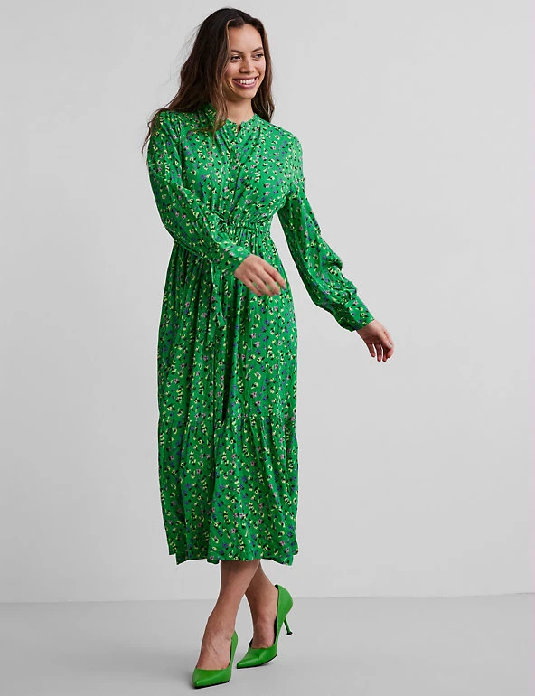 Channel a vintage vibe with this floral shirt dress from Y.A.S. It’s cut in a comfy regular fit with a round neck, pretty covered buttons through the bodice and a tie waist. This striking piece has a lightly gathered tiered skirt that falls to a maxi length. Made with sustainably sourced viscose.