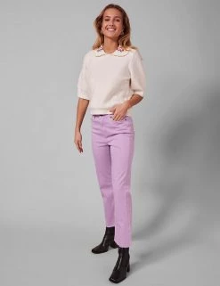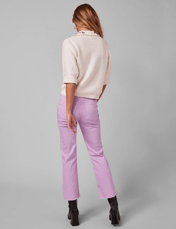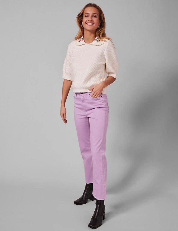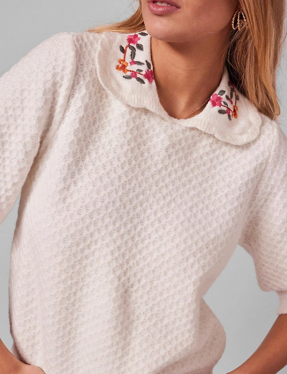 Channel casual elegance with this premium cotton-blend jumper by Y.A.S. This distinctive piece is cut to a regular fit and sports a statement collared neck with pretty floral detail for extra contemporary flair. It’s finished with an all-over knitted pattern, smart short sleeves and delicate ribbing along the cuffs and hem.